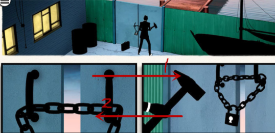 这一关比较简单,增加了新的机制,先对换一次,接着再对换一次。简单来说就是先将有铁锤的那张图移到左边,等主角推一下门后,再把这张图移到右边即可通关。
