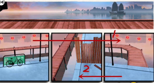 第五关这关稍微增加了难度了,先把第一第三画面对换,让人物从画面二过去,等到了第三张画面骑自行车的时候再把第二第三张图对换,让人物从小桥过去。这样就可以躲过警察的拦截顺利通关了。