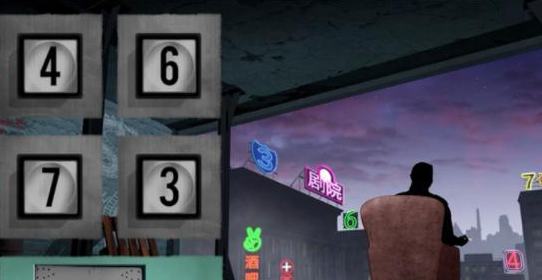 第九关也是比较简单的一个关卡,主人公进入雇主的房间,要根据雇主面前的景色来确定密码,密码顺序是数字依次亮起的顺序,因此密码是4673!