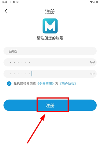 4、输入账号,密码,重复密码,勾选用户协议,点击注册。