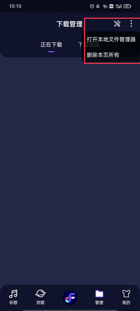 4、在【管理】界面,显示的是所有已下载到本地的音乐文件。您可以选择删除不再需要的音频文件。