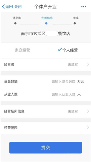 8、再填写经营者信息,资金数额、从业人数和场所等等信息,最后点击提交即可。