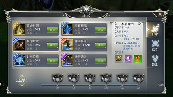 2、日常玩法,全天开放,玩家达到28级后即可解锁挑战,每日可以挑战5次,可以获得重塑结晶、竞技积分等道具,还有独特黎明竞武商店,可以使用竞技积分兑换道具。
