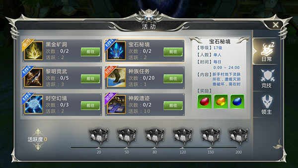 2、日常玩法,全天开放,玩家达到17级后即可解锁挑战,每日可以挑战2次,以产出宝石为主,限时挑战五分钟,保护的结界越好,宝石越多。