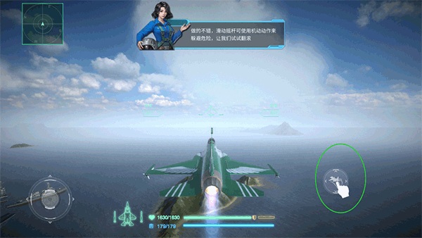 2、之后可以根据指引操作机器,左下方的圆圈是方向控制摇杆,可以先往左滑动。控制飞机向左飞行一段距离。