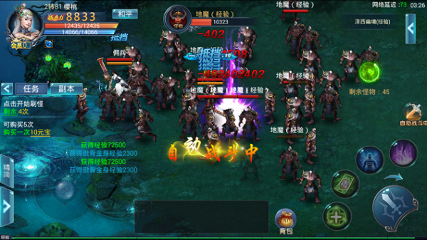 引入全新的世界BOSS战斗系统,高级道具免费获取,为非充值玩家提供福利;智能组队和自动战斗功能,确保玩家经验快速提升,不落后于人;全新道具掉落机制,小怪也可能掉落极品装备,让玩家角色快速成长。