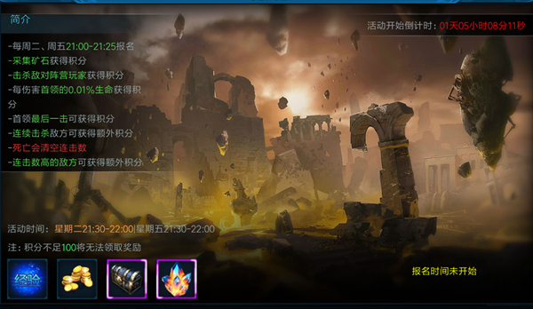 每周二和周五晚上21:30至22:00开启。玩家通过采集矿石、击败敌方玩家、攻击或击杀首领积分,连续击杀带来额外积分,最终根据积分领取奖励。