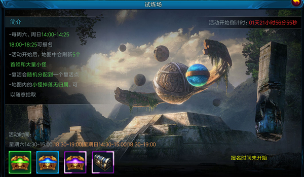 每周六日的14:30和18:30开启,持续半小时。场内会刷新5个首领和大量小怪,玩家击杀怪物时可捡取掉落的奖励道具,场内道具不绑定,可自由抢夺。