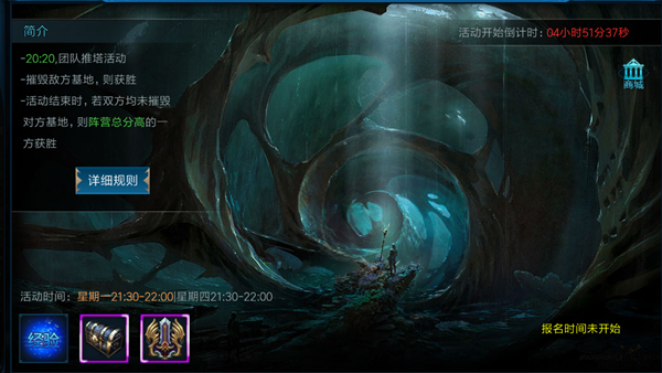 每周一、四晚上21:30至22:00。20v20团队战,先破敌基地者胜,若双方基地健在,则按积分决胜。