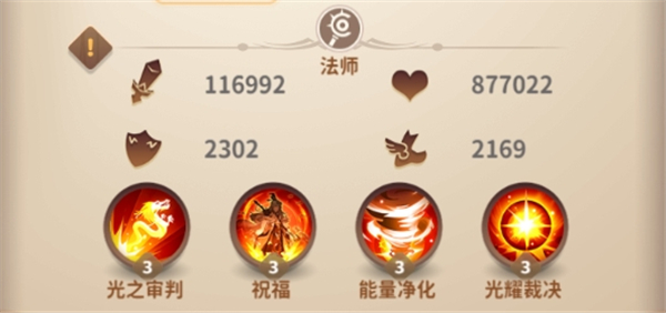 主动技能1:光之审判,对敌方攻击最高的单个英雄造成大比例法术伤害,给其附加【攻击降低】状态和降低攻击。