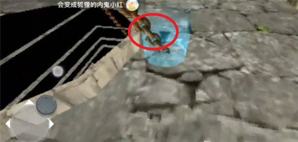 6、之后从楼梯上去,玩家可以发现一个石头房子,进入房子可以看到有铁链,玩家按照提示将铁链给解开,中间那个黑色袋子会掉下去。