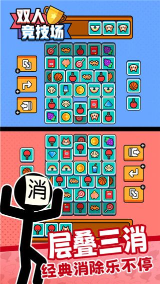 在游戏中,还加入了竞技玩法——锦标赛,锦标赛中有着五个随机的小游戏,采用的是五局三胜制度,我们将会与随机的对手进行竞技,并想办法获得对局的胜利。另外,在双人竞技场官方正版最新版游戏内还有其他更多丰富的趣味玩法等你来探索体验,喜欢的朋友快来下载吧!