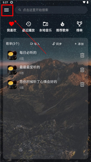 5、云同步功能:只要登录账户,个人的音乐库和歌单就能实现跨设备无缝衔接,无需担心数据丢失或重新整理歌单的麻烦。1、首先进入页面点击左上角的三条横杠。