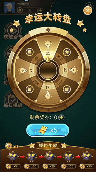包含8个格子,分为4个金币4个道具格子,金币分别为X5,X10,X20,X50;道具分别为X1,X1,X2,X2下方为抽奖礼盒,分为抽5次,10次,20次,35次,50次五种进度宝箱,每积满50次重新计算。抽奖消耗奖票,每次消耗*3张奖票。抽奖票:可以用来参加转盘抽奖,可在每日挑战里获得。