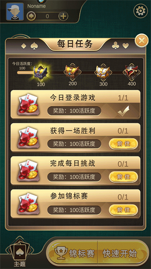 有四个任务,每个任务增加100活跃度。活跃度达到可以开启宝箱,完成一个任务增长一段进度条,进度条满了可以打开宝箱。进度条分为四段。未完成则显示前往可以点击,点击前往后进入到相应的游戏界面。完成奖励活跃度进度条增长可以开启宝箱。第一个宝箱+5金币 第二个宝箱+10金币 第三个宝箱+20金币。第四个宝箱赠送魔法道具*1。