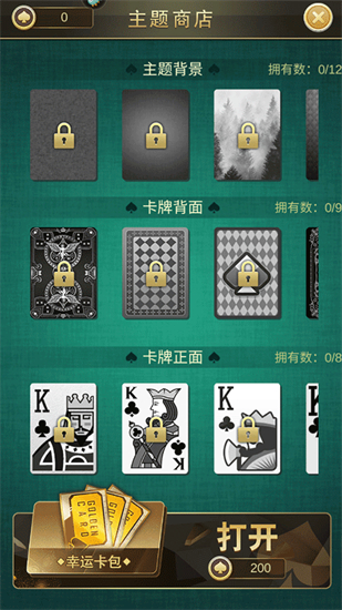 点击OPEN花费200金币开启皮肤,重复皮肤弹窗提示已有该皮肤并返还100金币。左右滑动可以显示更多皮肤,显示拥有的数量。未解锁的皮肤置灰加锁状态,点击可以查看到大图和解锁条件。点击已拥有的皮肤显示已拥有状态,并可以查看大图。