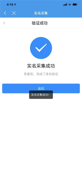 7、系统将自动识别面部成功后会显示“实名采集成功”,到此采集流程结束。