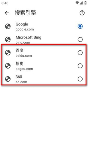 3、选择百度、搜歌或360搜索引擎。(注:google搜索和bing没梯子国内是用不了的)
