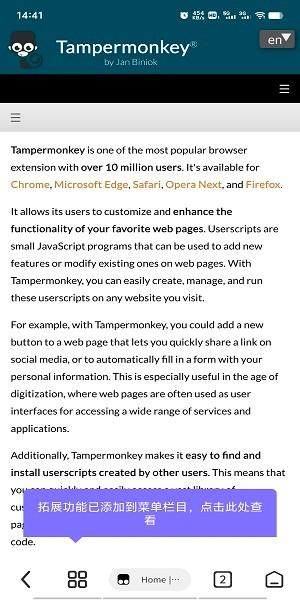 3、大量浏览器脚本,包含拼页、百度文库助手、网页复制解除、繁简体转换等。4、同时您可以在edge浏览器等下载雨见互联插件,也可与电脑端实现互联互通。
