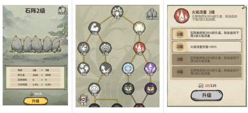石阵系统:石阵升级主要是增加城墙血量和百分比回血,对关卡内续航很有帮助;石阵技能可以理解为被动技能,不同技能之间具有完全不同的效果,激活后可同时存在生效,在推关时达到事半功倍的效果。