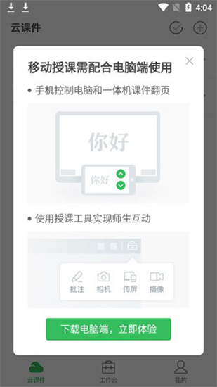 4、当老师在收款时,移动授课需要配合电脑端使用,使用手机控制电脑和一体机课件翻页,使用授课工具来实现师生互动。