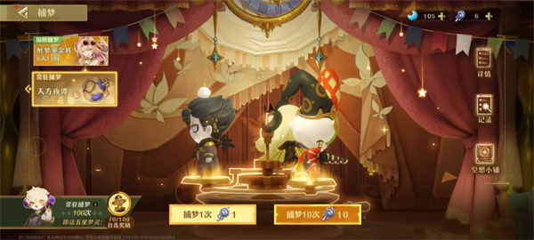 常驻池:会有一个100抽自选,个人建议选择镜之梦,强度有还可以后台挂草。在【天方夜谭】中,每10次捕梦必得一位四星或以上梦灵,每60次捕梦保底必得五星梦灵。同一星级的所有梦灵均分出率【天方夜谭】的捕梦类型为常驻捕梦,与其他类型捕梦活动的捕梦保底次数相互独立计算,互不影响。