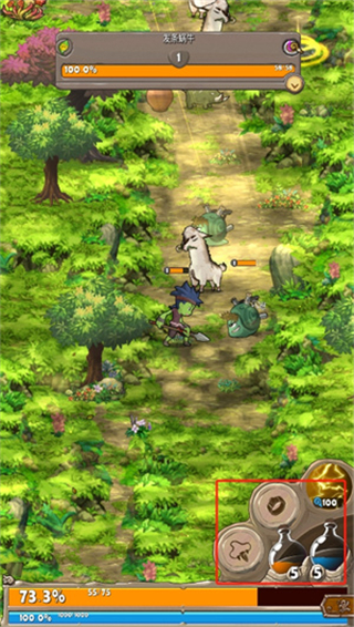 8、一旦角色靠近怪物,就会进入紧张的战斗页面。此时,角色会自动发起攻击,玩家只需点击右下角的按钮来使用技能或补血药品,确保自己在战斗中保持优势。