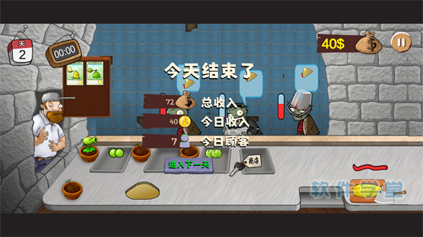 6、沙威玛大战僵尸每一局的时间很短的,注意保持手速,结算完点击进入下一天,继续游戏吧!