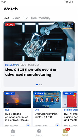 在CGTN软件中,还加入了直播版块,这里会直播各种各样的事件,找到感兴趣的直播点击就可以直接观看,而且用户登录之后还可以在直播间发送弹幕,与其他的用户进行互动,此外,这里还有着回放功能,用户可以在这里观看直播的回放,即便是错过直播也不用担心错过信息。