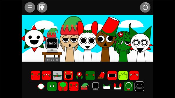 同时,游戏模式也为玩家进行了进一步的优化,支持横屏全屏展示,并且提升了游戏的加载速度,启动就能立马开始玩。恐怖模式也同样加入了色彩鲜明的节日风格,喜欢的小伙伴们不要错过,一定要来试试,圣诞节马上就要到了,赶快来下载体验这款节奏盒子sprunki圣诞节版本吧!FUN tmie!1、个性化装扮:将圣诞帽、圣诞发箍、衣服服饰等装饰物放在人物身上,创造圣诞风格角色。