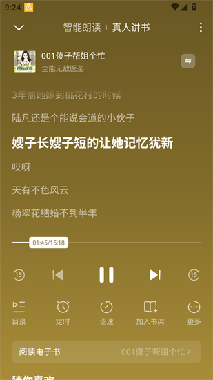 3、立即就可以开始听书,在最顶部我们可以选择智能朗读和真人讲书模式,小编在这里还是推荐真人模式的。