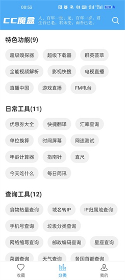 2、在首页分类中,包含多项特色功能、日常工具、查询工具等,想免费看剧的朋友可以直接点击影视快搜功能。