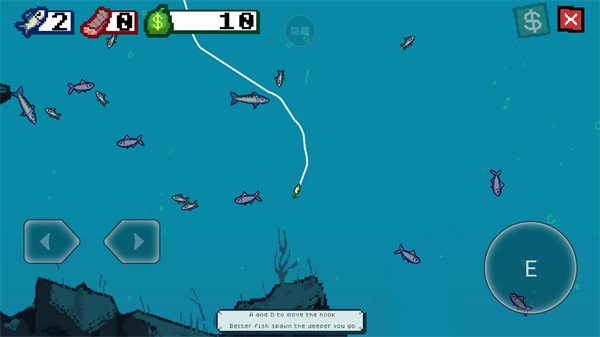 3、简单操作:通过点击和方向键控制即可操作人物,使得玩家可以快速上手游戏。1、从最左边开始,互动开始钓鱼。钓鱼线会自动下降;使用A和D来控制它的方向。用鱼钩撞击一条鱼,对它造成伤害,伤害足够后将它钓上来。