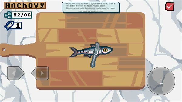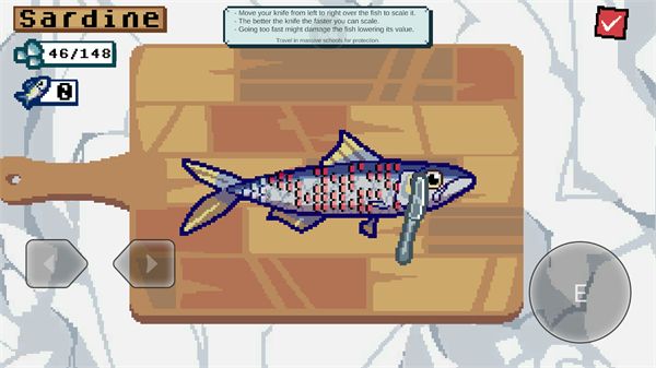 海上餐厅像素版是一款玩法令人上瘾的刮鱼鳞手机游戏,英文名为scale the depths。在游戏开始时,玩家只需要走到最左边点击按键E即可开始钓鱼,随着你的操作,钓鱼线会沉入海里,然后你可以使用方向键来控制它的方向,寻找并钓起鱼儿。然后,玩家需要将钓到的鱼带到去鳞站,给刚捕到的鱼刮鳞。