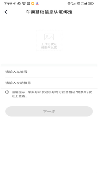 1、首先进行车辆基础信息认证绑定,用户需要在这里上传行驶证或购车发票,随后输入车架号和发动机号