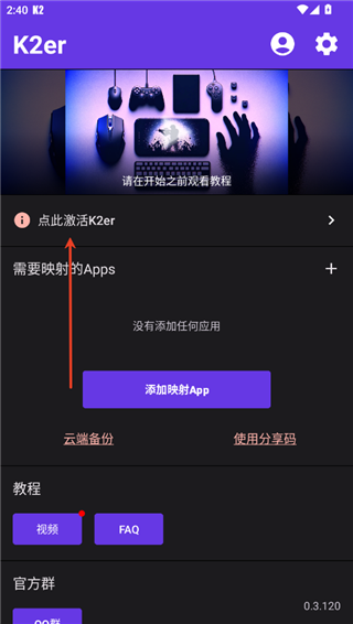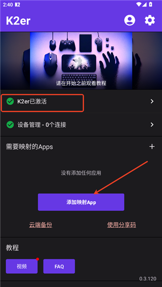 3、在k2er软件主页面中可以看到已经激活了,点击中的“添加映射app”