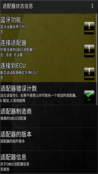 4、在torque车况适配器状态信息中, 我们可以看到蓝牙功能,连接适配器,连接到ecu等功能是否正常