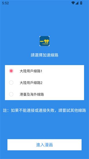 2、打开app后同意用户协议后,选择合适的线路以进入软件阅读漫画。