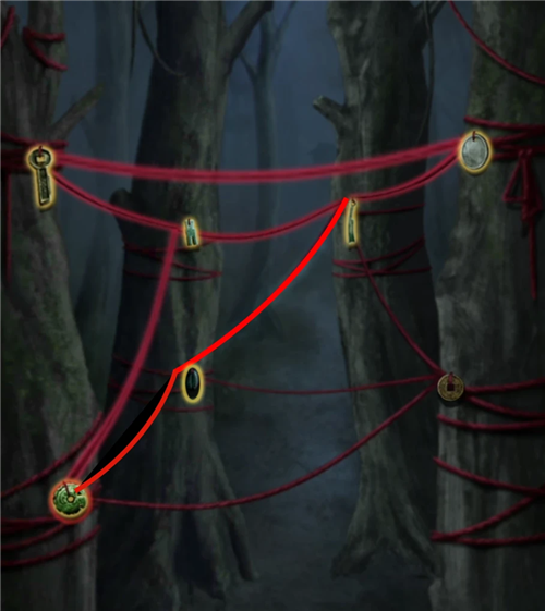 回到汽车场景,查看汽车后备箱,刚刚提示我们卡住了,使用铁锹暴力开箱,这车就好像不是自己的一样!开箱后拿到千斤顶,再次回到树林场景,查看左边的墓碑,对墓碑使用千斤顶后使用小树枝,注意有跳脸小高能,高能过后拿走书查看一下是个阵法,记下来后点击前面有点看不清的红线,点亮几个古钱让阵法和书上一样就能开路了。
