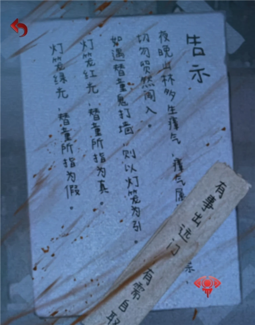 然后拿走婆婆右边的扫帚,转身回到长藤古宅替童街道场景,查看左边的杂货店门口,门左侧有一摊黑东西,对这个脏东西使用扫帚就能看清了,写的是我们后面要用到的提示,重点是红色是真绿色是假,记好了后面要用。