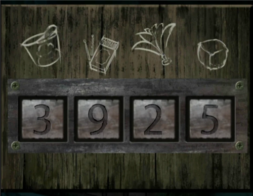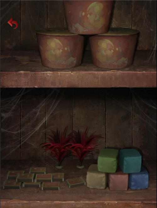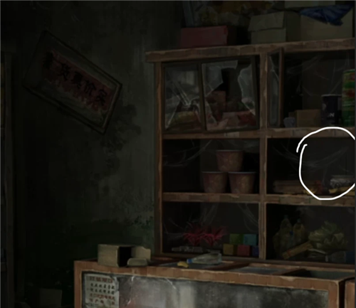 开灯之后地上掉了个竹签,后退回到街道场景,查看左边杂货铺,对门缝使用竹签成功开门,这里我们提前注意一下死路右下角的箱子提示,依次是杯子-火柴-毽子-球。进入杂货铺后点击后面的货架,货架左侧有点眼熟,原来应该是泡面-火柴-毽子-沙包啊,这沙包也太抽象了!数一下数量3个泡面,9盒火柴,2个毽子,5个沙包,所以我们获得了数字密码3925记下来。