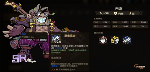 其他都说过了,重点介绍一下内迪。作为雷属性里比较好的肉盾,二技能自带嘲讽+回血,最重要的是被动免伤,叠到10层感电buff有50%的免伤,而电队里感电buff很容易叠满10层,作为前排,常驻50%免伤是非常强的。不够内迪有个硬伤,被动的免伤需要三星才开启,所以低星用不了