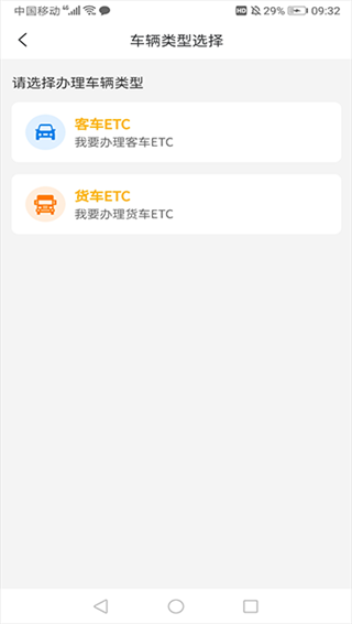 4、选择需要办理的车辆类型,这里有客车ETC和火车ETC