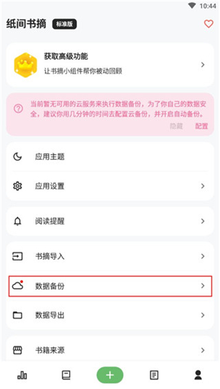在书伴阅读app最新版中,还为用户带来了数据备份功能,此功能可以根据用户的备份来还原相关的数据,数据备份同时使用了本地备份和云端备份两种方式,从而保障数据的安全,有需要的小伙伴快来下载体验吧。