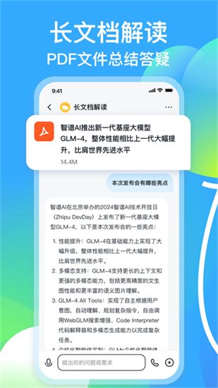 此外,软件还支持长文档解读和PDF文件总结答疑,帮助用户快速提取关键信息,提升学习和工作效率。它还具备AI生视频等功能,让大家能轻松生成高质量的视频内容,非常适合学生、职场人员和其他创意工作者。总之,智谱清言app最新版助力用户在各个领域取得更好的成绩,有兴趣的朋友欢迎前来下载!