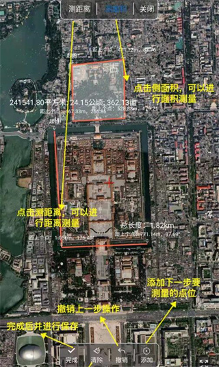 测量完成后,如下图:测量距离、测量面积中两个点直接会显示距离、方位角数据。