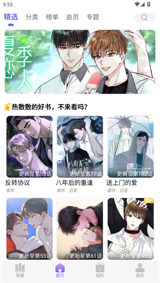 当你看到喜欢的漫画时,可以将其加入自己的收藏,软件会自动记录阅读进度,方便用户继续阅读,当然了,这里还有缓存功能,缓存之后用户就不用担心网络问题,随时随地可以进行观看。在耽漫神器app还为用户带来了各种福利,如签到领书币,阅读领金币等,书币可以用来解锁漫画,金币则是可以兑换会员和下载缓存漫画,让用户可以更好的阅读漫画。