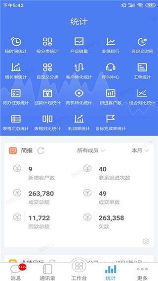 客户无忧app还加入了即时通讯功能,你可以直接在这里与公司进行对话,确保可以及时获得有效信息,而且加入了统计版块,你可以在这里查看自己的简报,业绩目标,排行榜等信息,还可以查看产品效率,目标完成率等,让你可以更好的掌握客户关系。