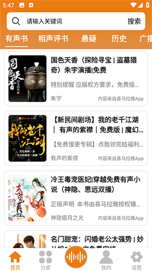 3、分类精准浏览:细分小说、历史、情感等标签,快速定位兴趣内容。4、无损音质还原:采用专业声学处理,还原演播室级声效,支持3D环绕声专区。
