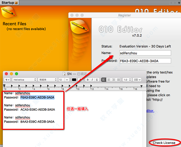 “SN”文本中三组注册码,任选一组,如图复制到注册框中,最后点击“check license”;